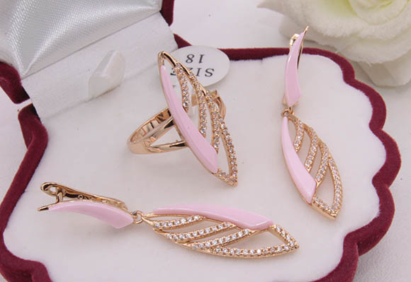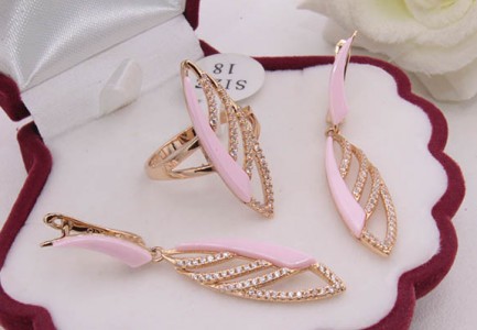 Ювелирный сплав, гипоаллергенное золотое покрытие (из золота 585 пробы), вставки — керамика и фианиты. Длина серег 4,6 см, английский замок. Размеры кольца: 17.