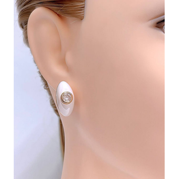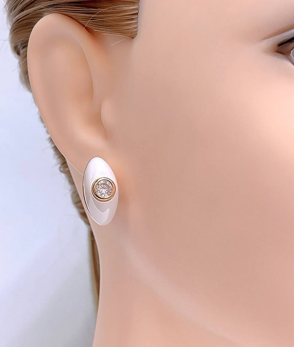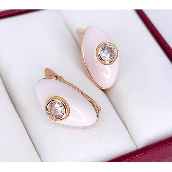 Не вызывающая аллергии бижутерия. Ювелирный сплав, покрытие — золото 585 пробы, вставки — керамика и фианиты. Высота серег 2 см, английский замок.