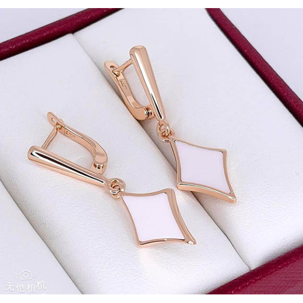 Гипоаллергенная бижутерия. Ювелирный сплав, покрытие — золото 585 пробы, вставки выполнены из керамики. Высота серег 3,6 см, английский замок.