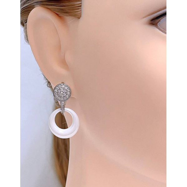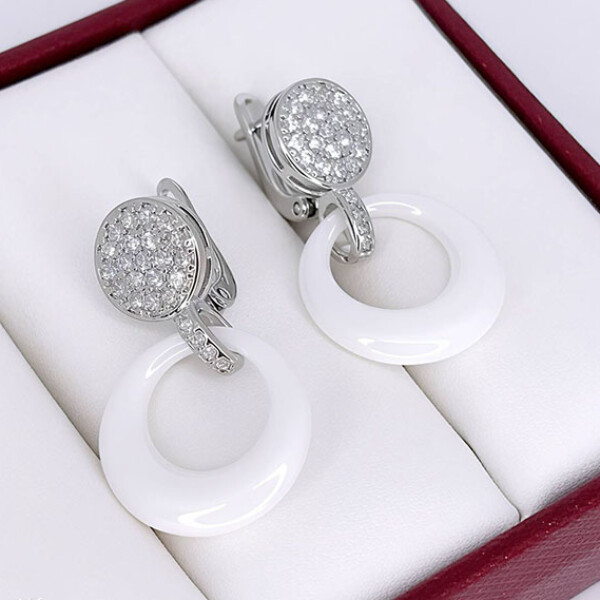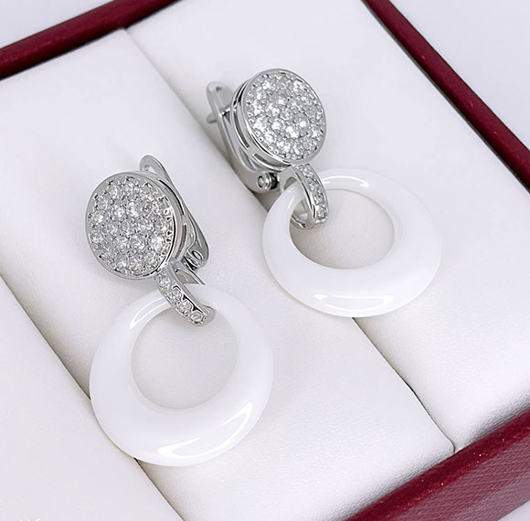 Гипоаллергенная бижутерия. Ювелирный сплав, покрытие выполнено из серебра, вставки — керамика и фианиты. Длина серег 3,2 см, английский замок.