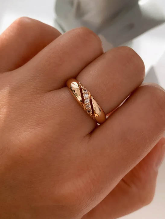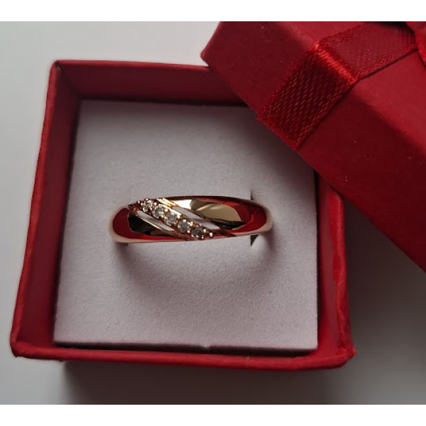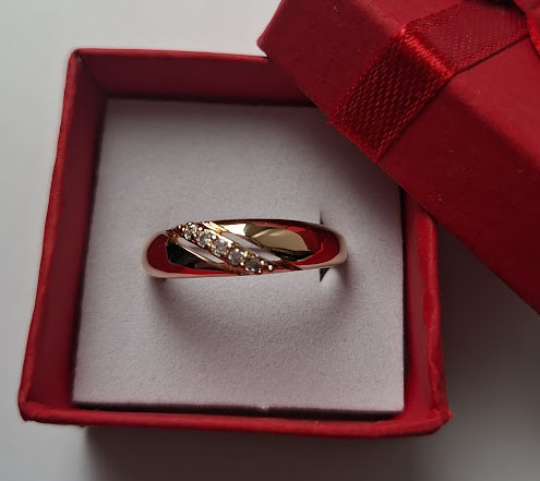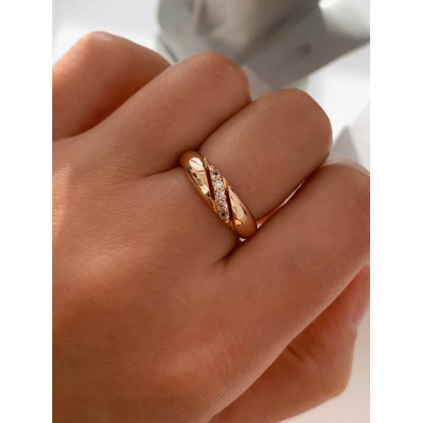 Очень классный дизайн. Выглядит как обручальное. Фианиты блестят не хуже бриллиантов. Позолота качественная, видно что реально настоящее золото. Ну и сами фианиты сидят в гнездах супер надежно. Всё качествено и акуратно сделано в этом колечке. Рекомендую!