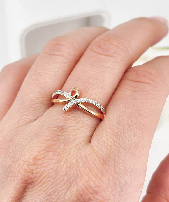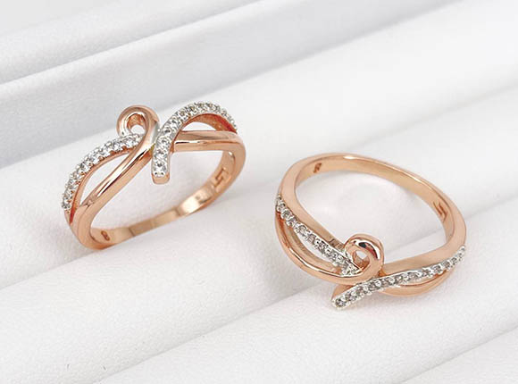 Не вызывающая аллергии бижутерия. Ювелирный сплав, покрытие — золото 585 пробы и родий, вставки выполнены из фианитов. Размеры: 16; 17; 18; 19; 20.