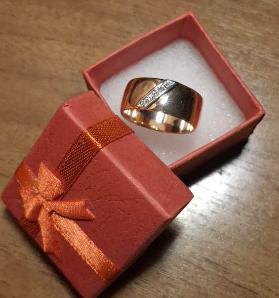 Очень симпатичное кольцо, придется по вкусу любителям классики. Сделано кольцо аккуратно, нет никаких огрехов, выглядит как дорогое золотое. Большой его плюс — камни за одежду не цепляют. Не скажу, что ношу часто, но пока все отлично, покрытие не потускнело, без царапин, фианиты все на месте.