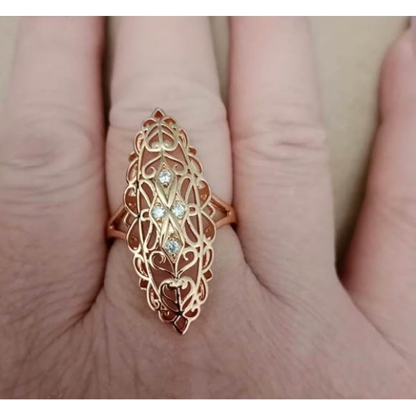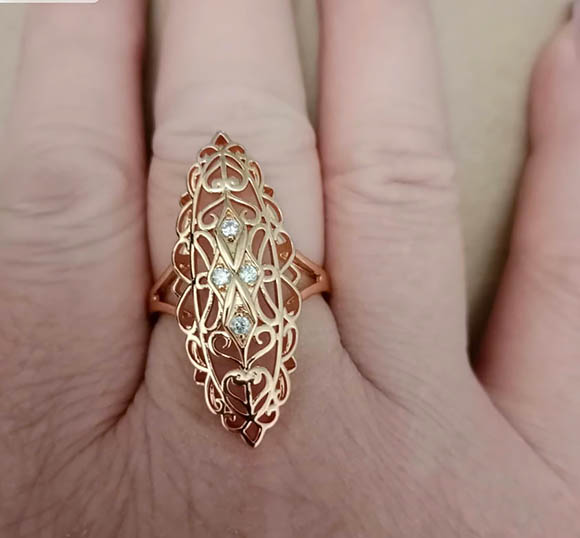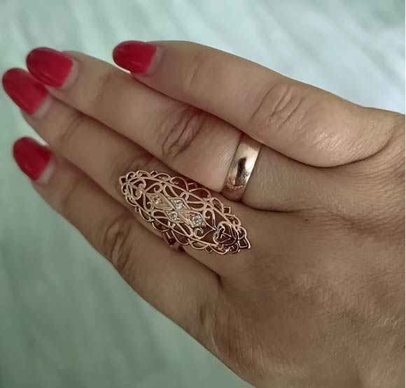 Украшения на этом сайте беру не в первый раз и ни разу не была разочарована. Нравится и дизайн изделий и их исполнение. Вот и в этот раз очень довольна покупкой. Крупное ажурное кольцо выглядит потрясающе. Кольцо заметное, самодостаточное. Небольшие цирконы придают ему нарядности. Ношу с огромным удовольствием.