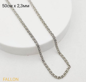 Не вызывающая аллергии бижутерия. Ювелирный сплав, покрытие — родий. Длина 50 см, ширина цепи 2,8 мм.