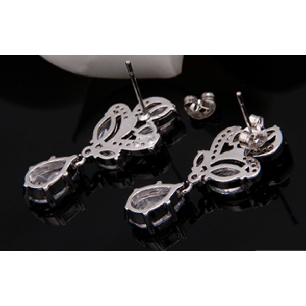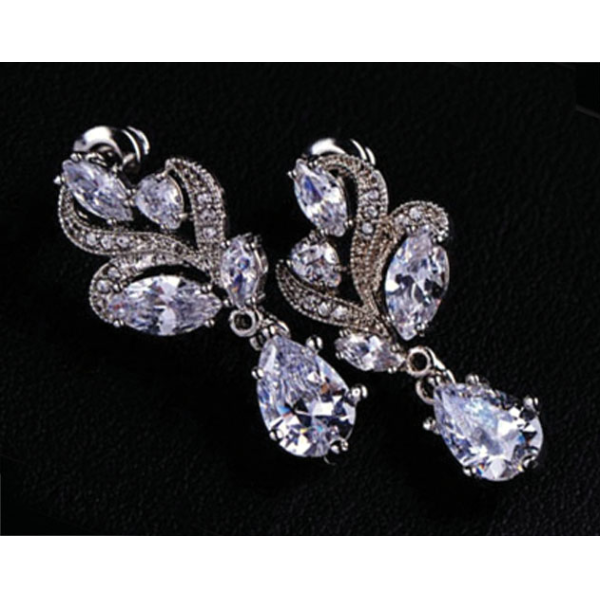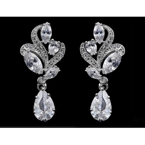 Гипоаллергенный ювелирный сплав, родиевое покрытие, вставки — фианиты. Застежка — гвоздик (штифт с фиксирующим зажимом). Высота — 28 мм, ширина — 13 мм. Осталось 3 пары.
