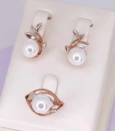 Не вызывающая аллергии бижутерия. Ювелирный сплав, покрытие — золото 585 пробы и родий, вставки — жемчуг. У серег английский замок. Размеры кольца: 18. Остался 1 набор.