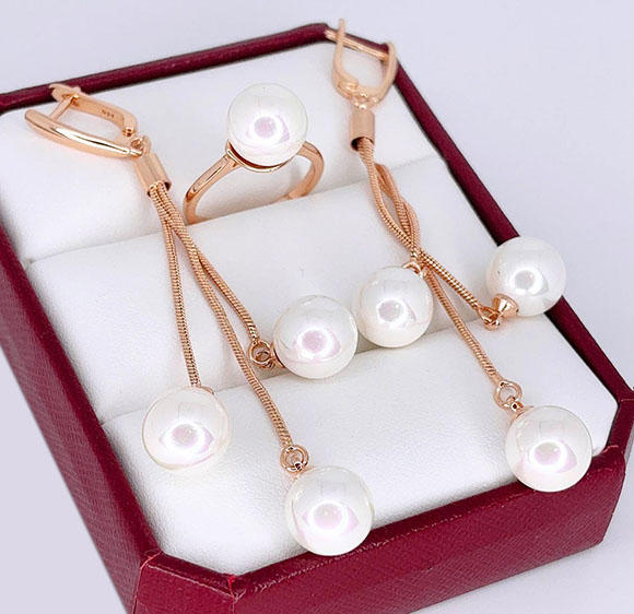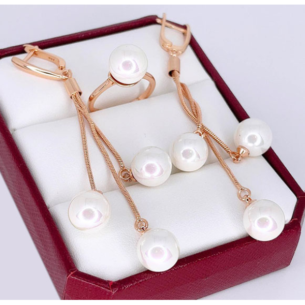 Позолоченный гипоаллергенный сплав (покрытие —золото 585 пробы), вставки — жемчуг. Длина 8,2 см, английский замок. Размеры кольца: 17. Остался 1 комплект.