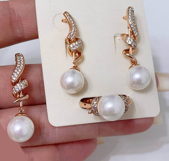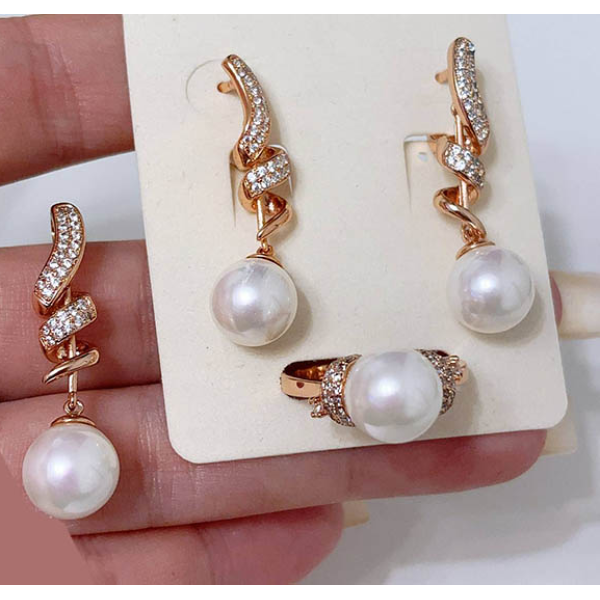 Гипоаллергенная бижутерия. Покрытый золотом 585 пробы ювелирный сплав, вставки выполнены из жемчуга и фианитов. У серег английский замок. Размеры кольца: 19. Остался 1 комплект.