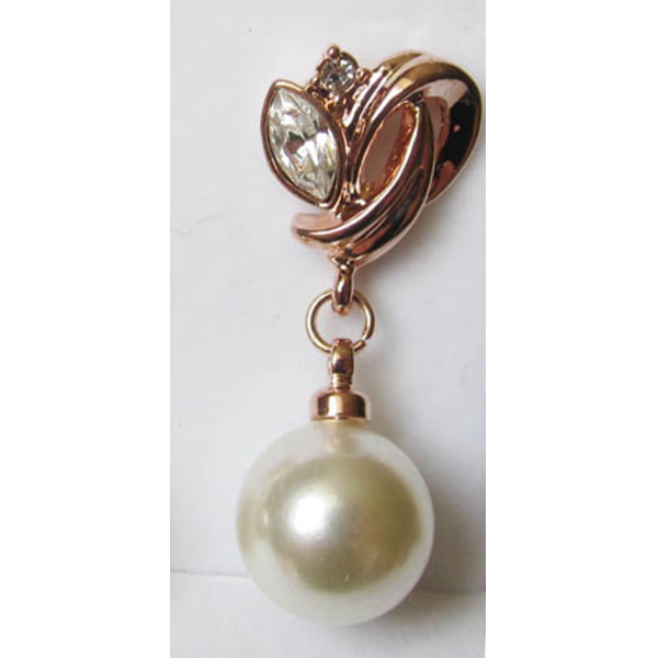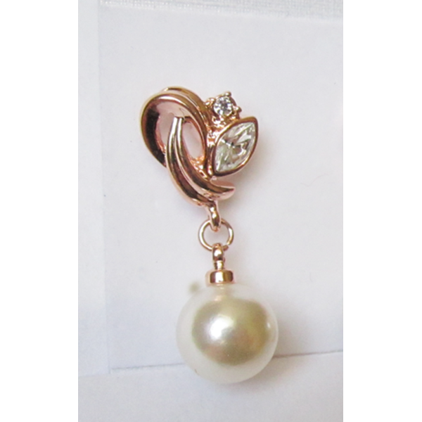 Гипоаллергенный ювелирный сплав, покрытие — золото 585 пробы (розовое золото). Нижняя часть серьги — жемчуг, вставка верхней части серьги — фианиты (цирконы). Застежка — гвоздик (штифт с фиксирующим зажимом). Высота — 28 мм, ширина — 11 мм. Осталось 3 пары.