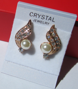 Гипоаллергенная бижутерия, покрытие — розовое золото золото (585 пробы). Вставки — жемчуг и фианиты. Застежка — гвоздик (штифт с фиксирующим зажимом). Высота — 24 мм, ширина — 13 мм. Осталась 1 пара.