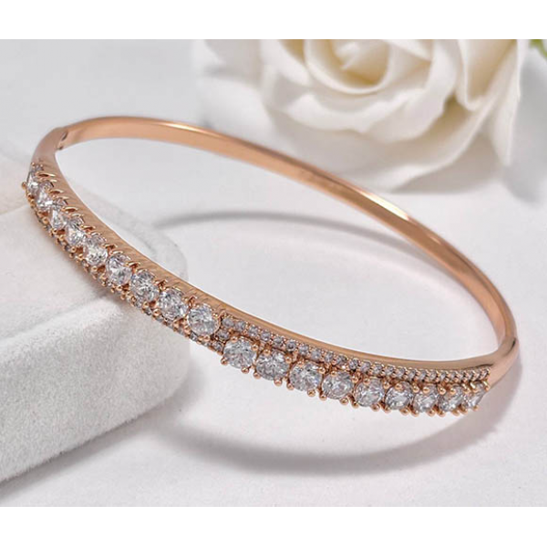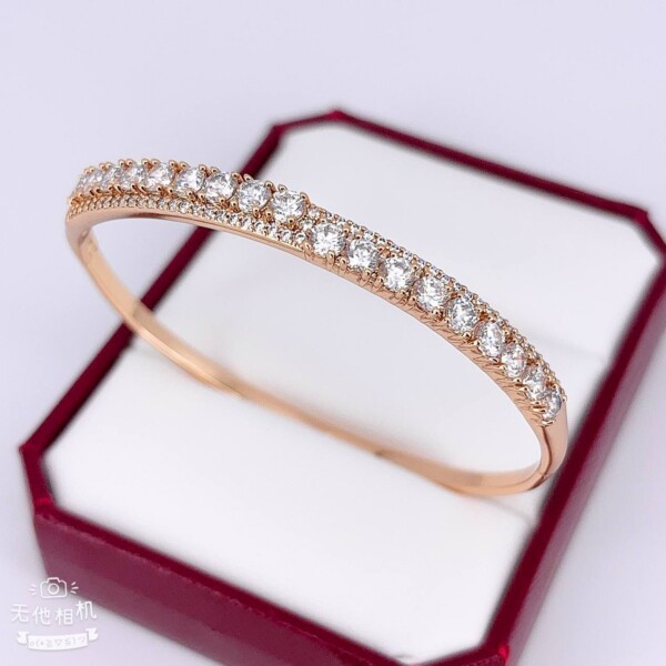 Ювелирный сплав, гипоаллергенное покрытие из золота 585 пробы, вставки — фианиты. Размер браслета 17,5 см, ширина 5 мм.