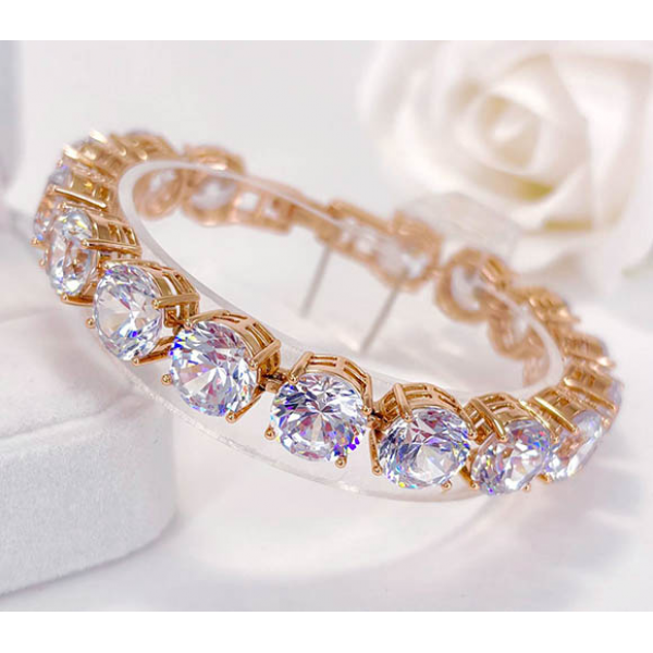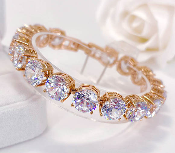 Гипоаллергенная бижутерия. Покрытый золотом 585 пробы ювелирный сплав, вставки — фианиты. Длина браслета 16,5 см + 2 см добор, ширина 9 мм.