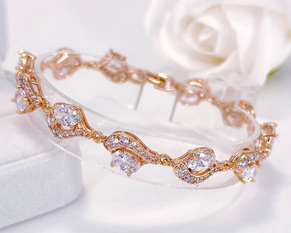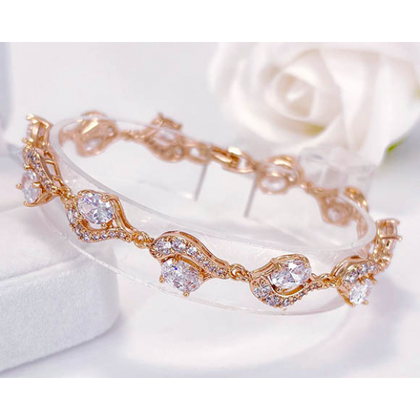 Позолоченный гипоаллергенный сплав (покрытие —золото 585 пробы), вставки — фианиты. Размер 18,5 см, ширина браслета 9 мм.