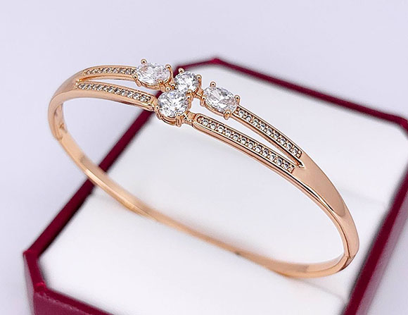 Не вызывающая аллергии бижутерия. Ювелирный сплав, покрытый золотом 585 пробы, вставки — фианиты. Размер 18 см.