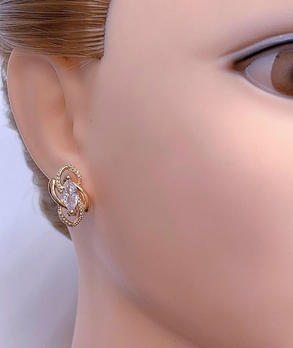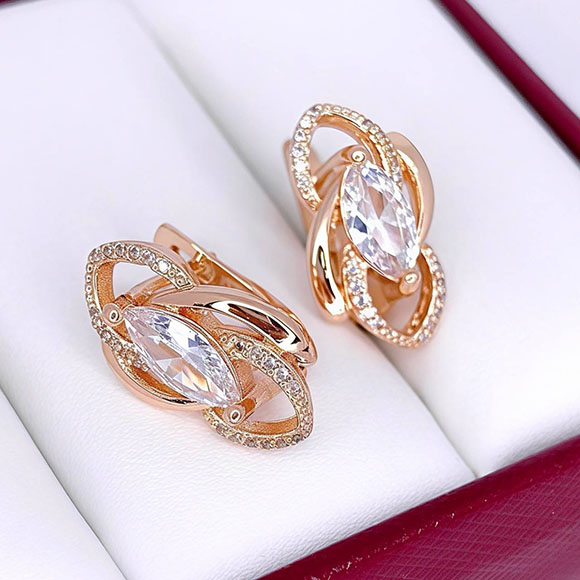 Позолоченный гипоаллергенный сплав (покрытие —золото 585 пробы), вставки — фианиты. Высота серег 2 см, английский замок.