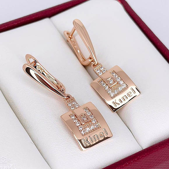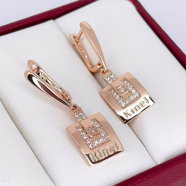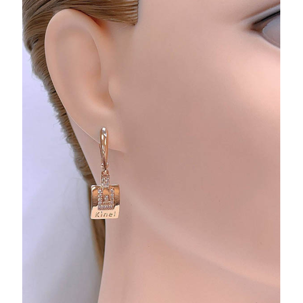 Не вызывающая аллергии бижутерия. Ювелирный сплав, покрытие — золото 585 пробы, вставки выполнены из фианитов. Высота серег 3,3 см, английский замок.